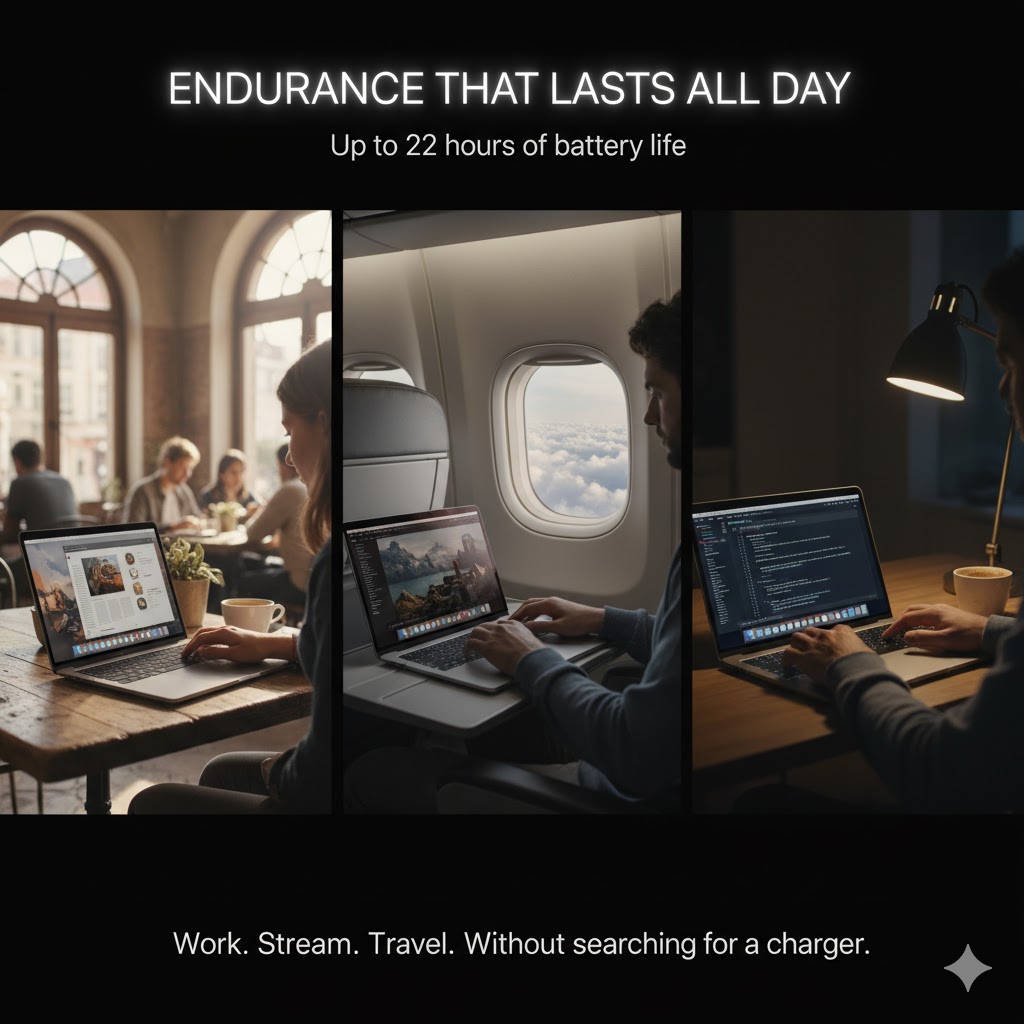 Battery anxiety is something many users know too well. But with the MacBook Pro 16”, that concern quietly disappears. With up to 22 hours of battery life, you can work, stream, or travel without searching for a charger.
