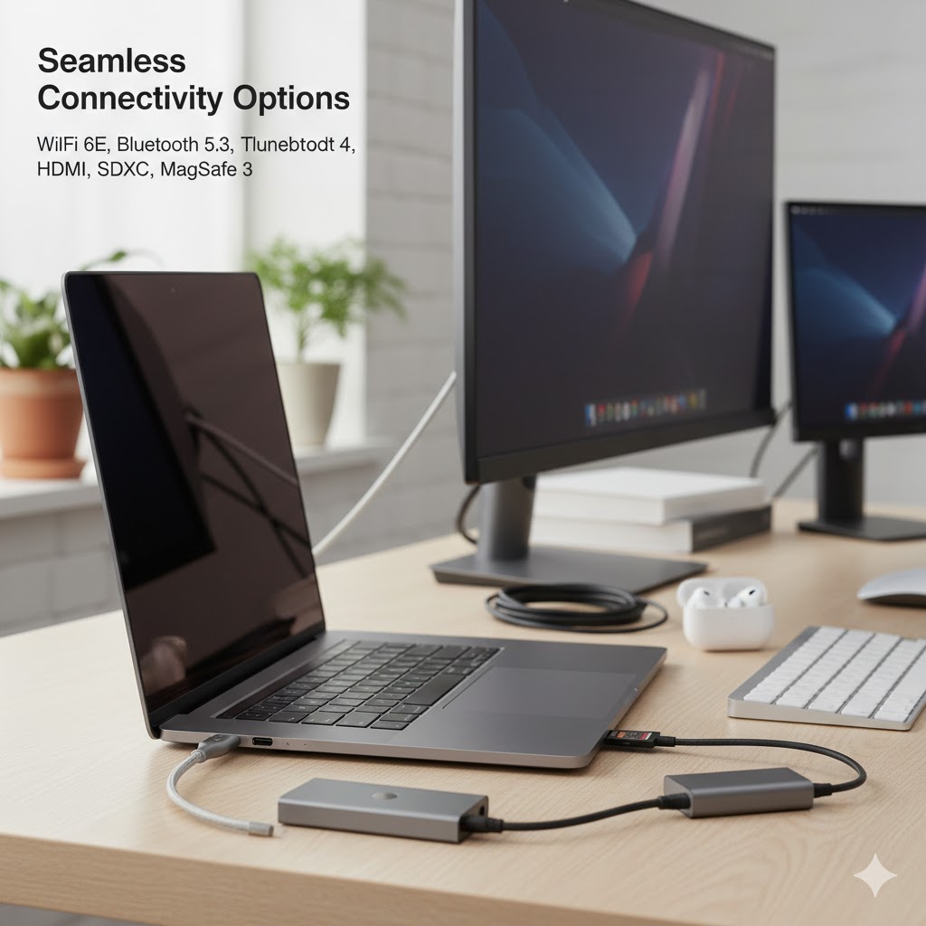 It also includes three Thunderbolt 4 ports, an HDMI port, an SDXC card reader, and a 3.5 mm headphone jack. You can easily connect monitors, hard drives, or cameras without needing extra adapters.